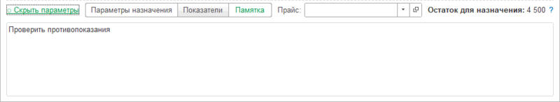 - В поле отображаются параметры назначения услуги, взятые из карточки услуги. Поле неизменяемое.