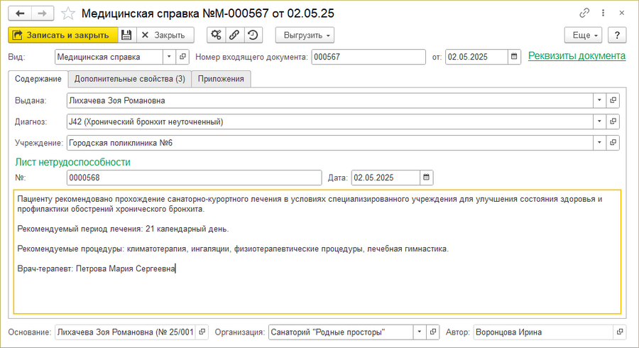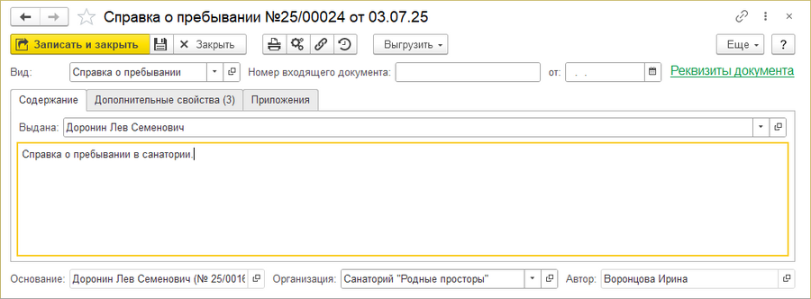 По умолчанию медицинская справка считается входящим документом — ее приносит пациент из медицинского учреждения, направившего в санаторий. Для такой справки печатная форма не предусмотрена, поэтому на ее форме отсутствует кнопка Печать.