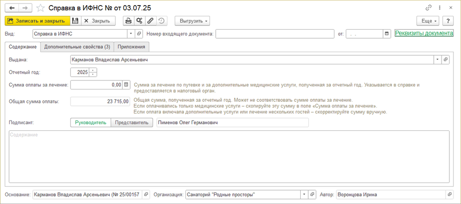 - Общая сумма оплаты, полученная от контрагента за отчетный год. Если общая сумма оплаты относится исключительно к медицинским услугам карты гостя, на основании которой создается справка, её можно скопировать в поле «Сумма оплаты за лечение».