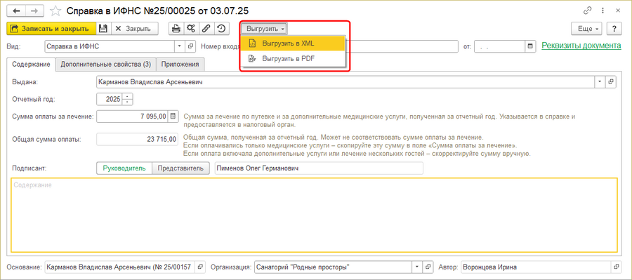 Кнопка Выгрузить позволяет выгрузить справку в форматах PDF или XML. Выгрузка справки в XML-файл по форме КНД 1151156 позволит загрузить справку в системы электронной отчетности, например, в Контур.Экстерн.