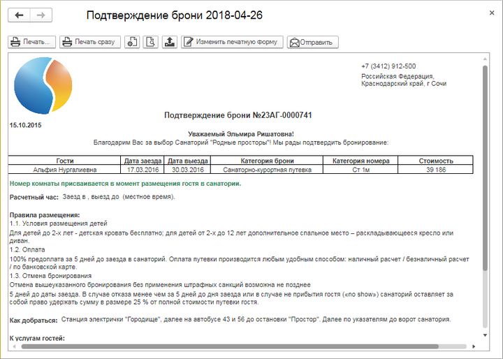 - уведомление о согласии (печатная форма «Подтверждение брони») — подтверждение клиенту о его приезде в санаторий;
