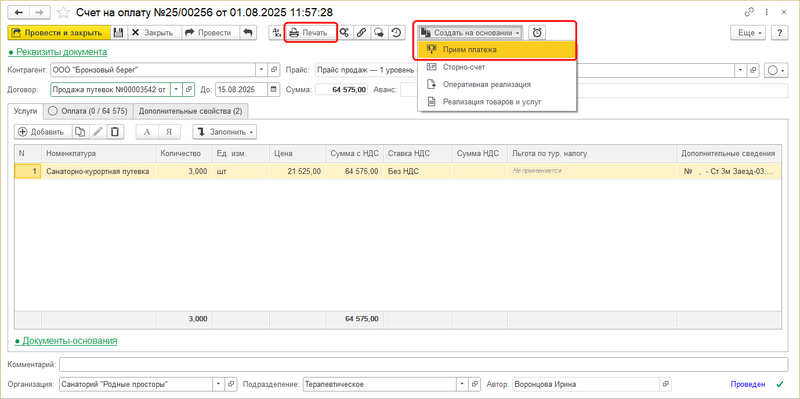 - При необходимости нажмите кнопку Печать для вывода печатной формы документа, которую можно распечатать или отправить контрагенту в электронном виде.