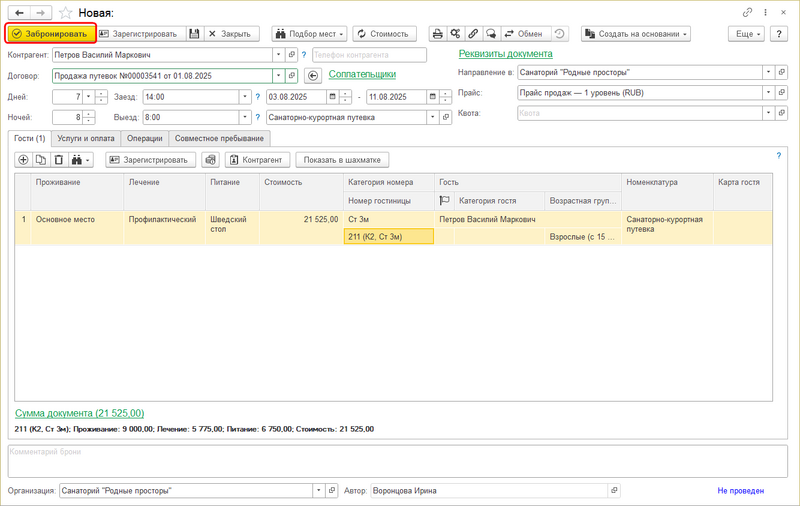 Если клиент подтвердил заявку и оплатил ее, из заявки можно оформить путевки для каждого гостя. Таким образом, путевка — это подтвержденная бронь. Оформляется созданием документа «Путевка».