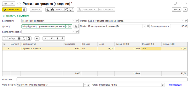 - При создании документов «Розничная продажа» выбирайте в качестве контрагента созданного обезличенного контрагента.