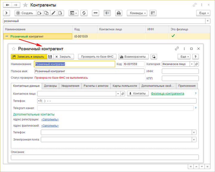 - В справочнике «Контрагенты» создайте одного универсального контрагента, например, «Физлицо» или «Розничный контрагент».