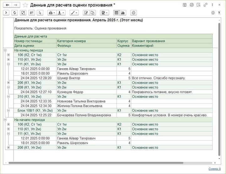 В каждом варианте отображаются последние N оценок на начало и конец выбранного периода с детализацией: дата и время оценки, гость и значение оценки.