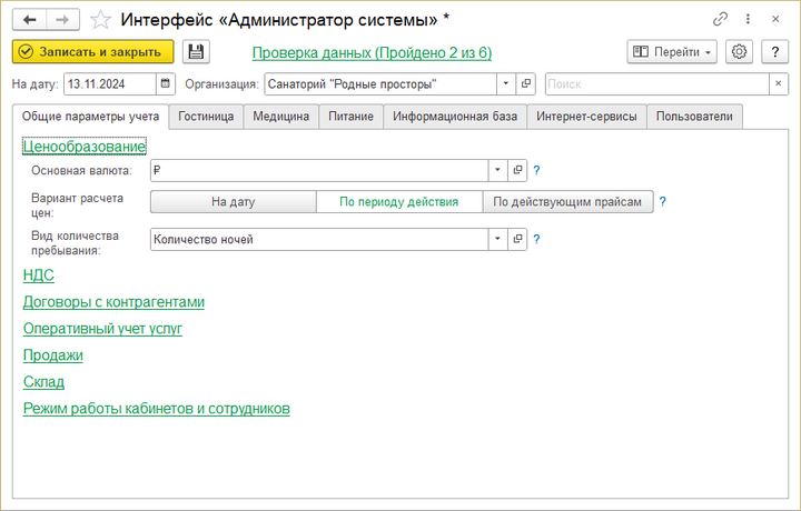 Параметры работы системы находятся в интерфейсе «Администратор системы» на закладке Параметры учета.