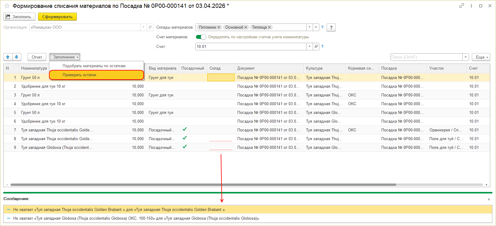 Формирование списания материалов - документ посадки - заполнение проверка по остаткам.png