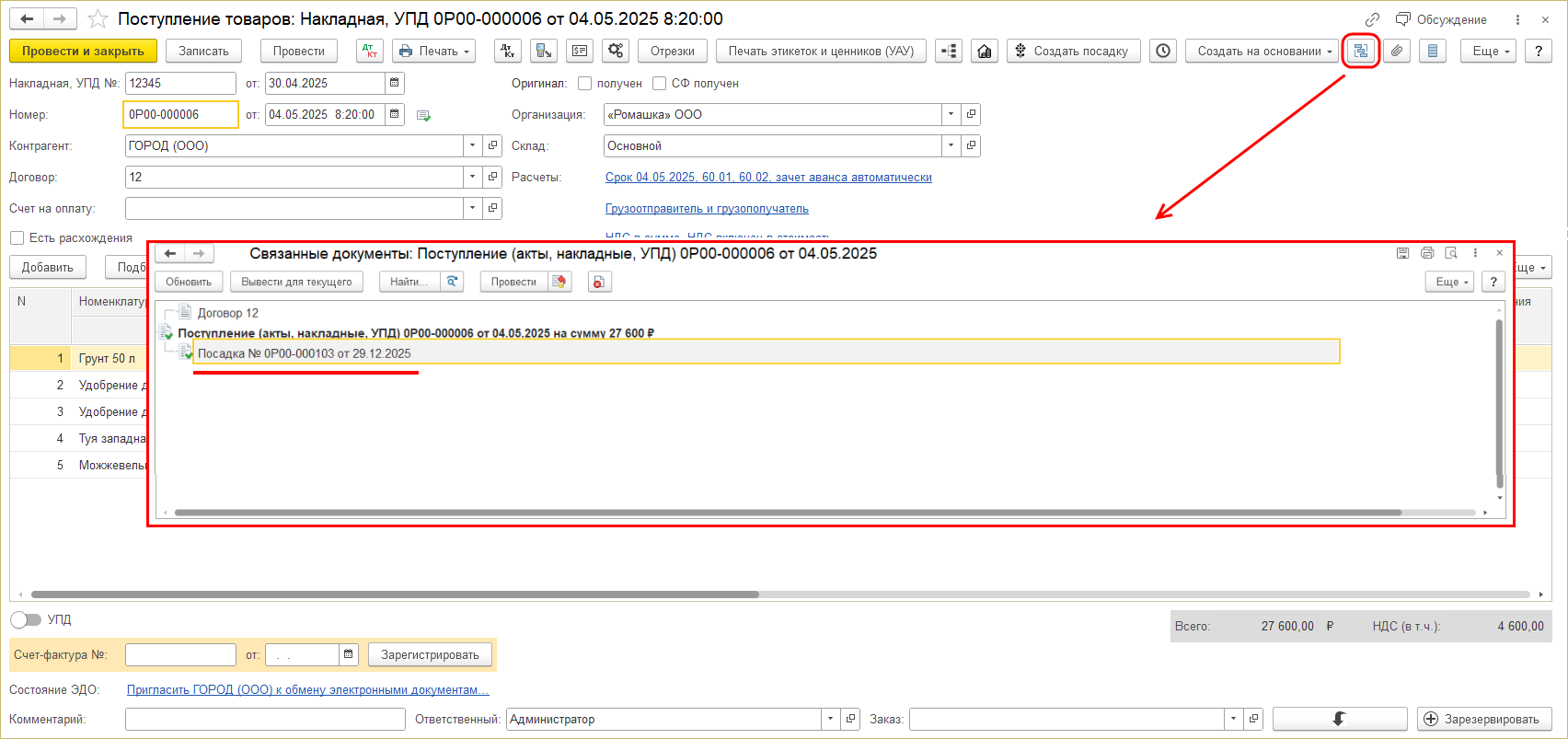 Файл:Поступление товаров - создание посадки - связанные документы.png